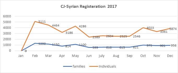 - CJ total registration numbers of Syrian refugees who approach the organization’s centres is 9640 Households, making 38,369 individuals throughout the 2017-year period from Jan.-Dec. 2017, distributed in (8) governorates, as clarified in the charts below: